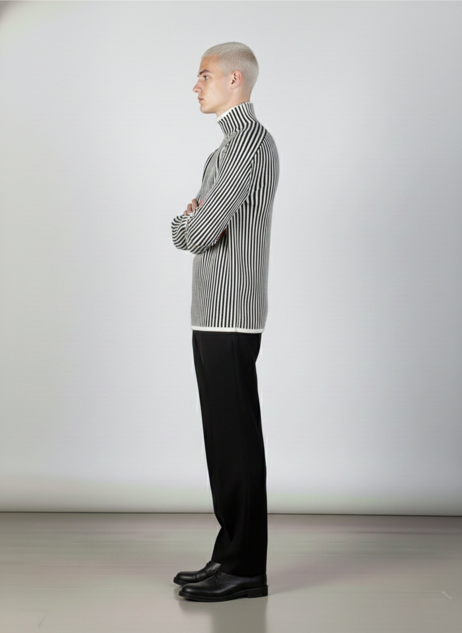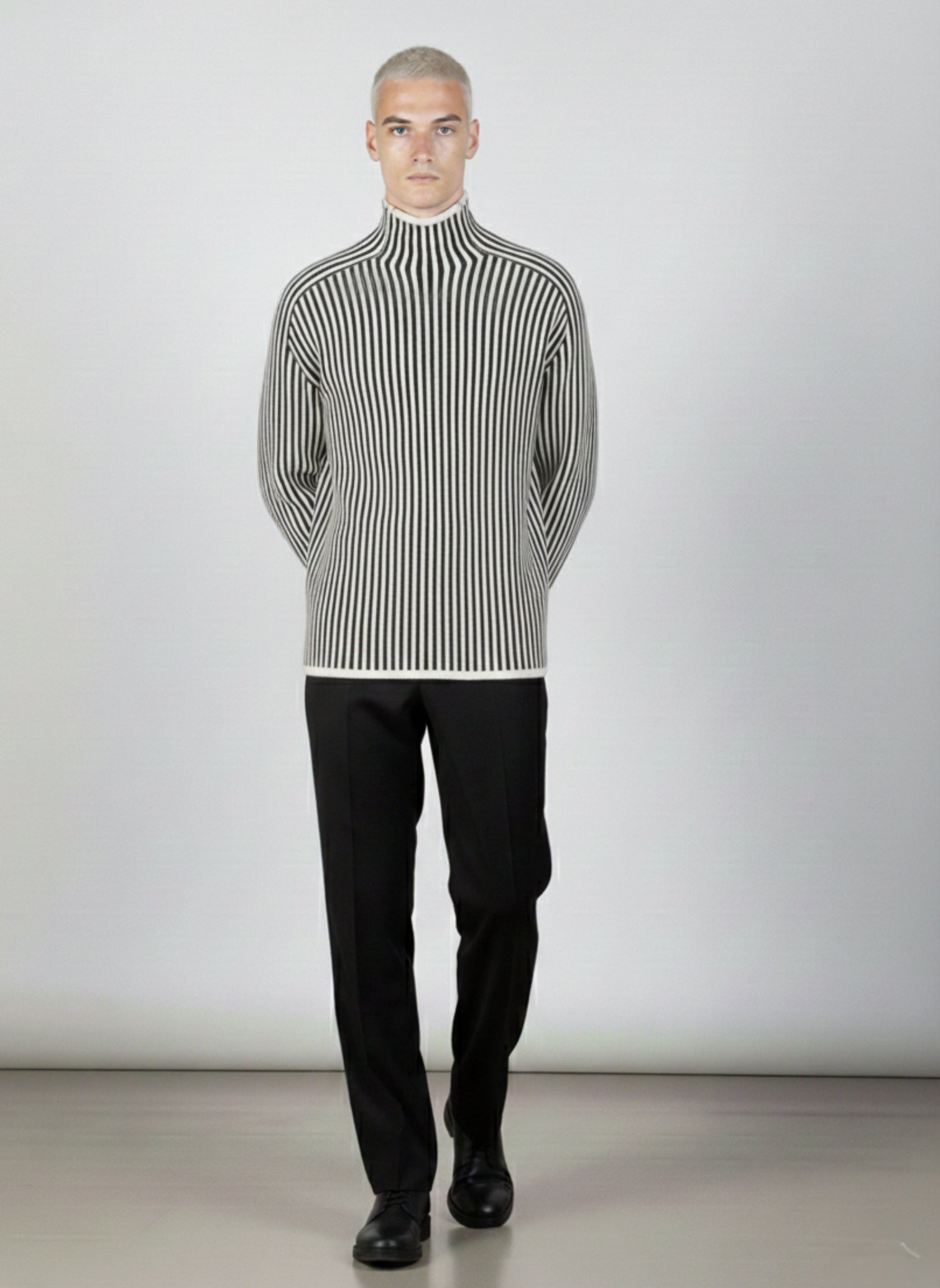 Our Adam turtleneck sweater features a striking vertical stripe pattern in classic Black and Off-White. The high mock neck and ribbed cuffs, and hem provide a clean, defined silhouette, while the structured knit offers a refined drape. This is more than just a layer; it is a statement of confident design to stand alone or anchor a sophisticated ensemble.