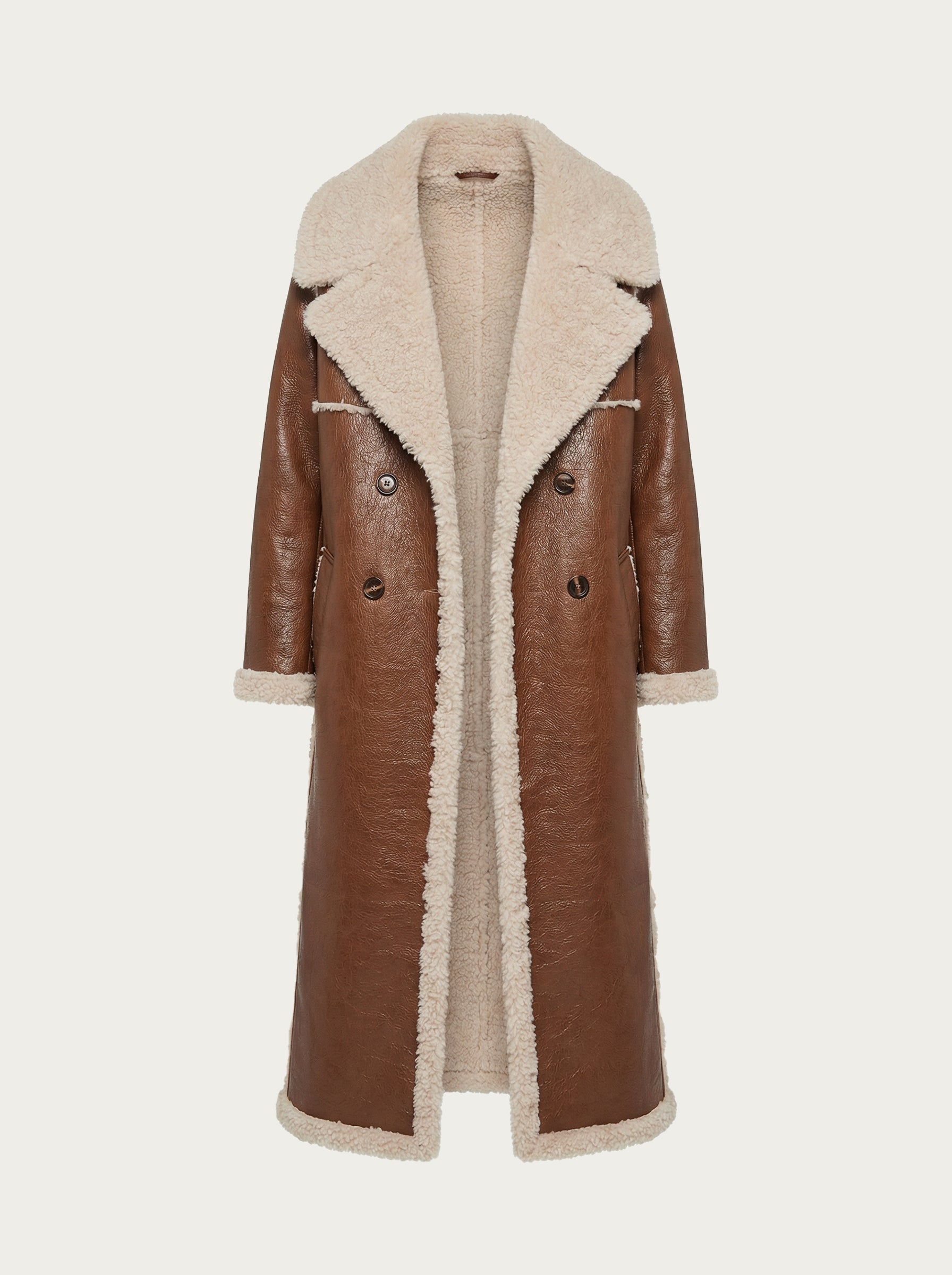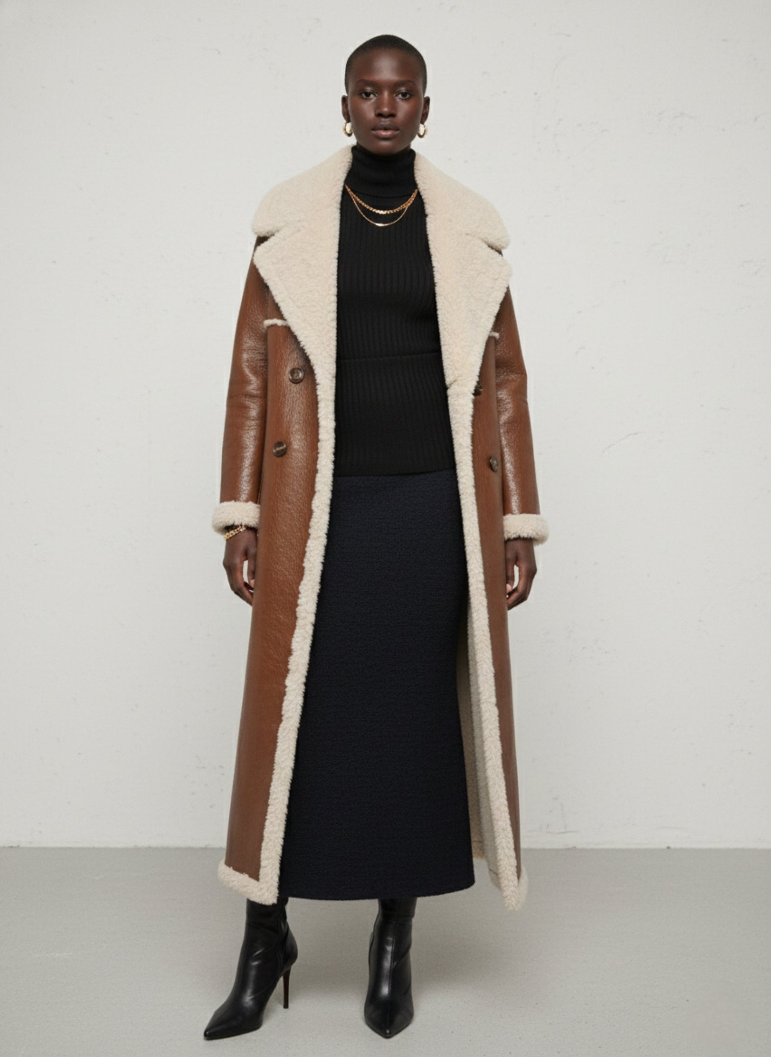 This coat is the ultimate piece of cold-weather armor. Crafted with a luxurious Chocolate Brown leather exterior, this double-breasted coat offers exceptional warmth without sacrificing high-fashion structure. The long, maxi length and sharp notch lapels ensure a powerful presence, while the visible shearling detailing along the cuffs and collar adds rich, tactile luxury.