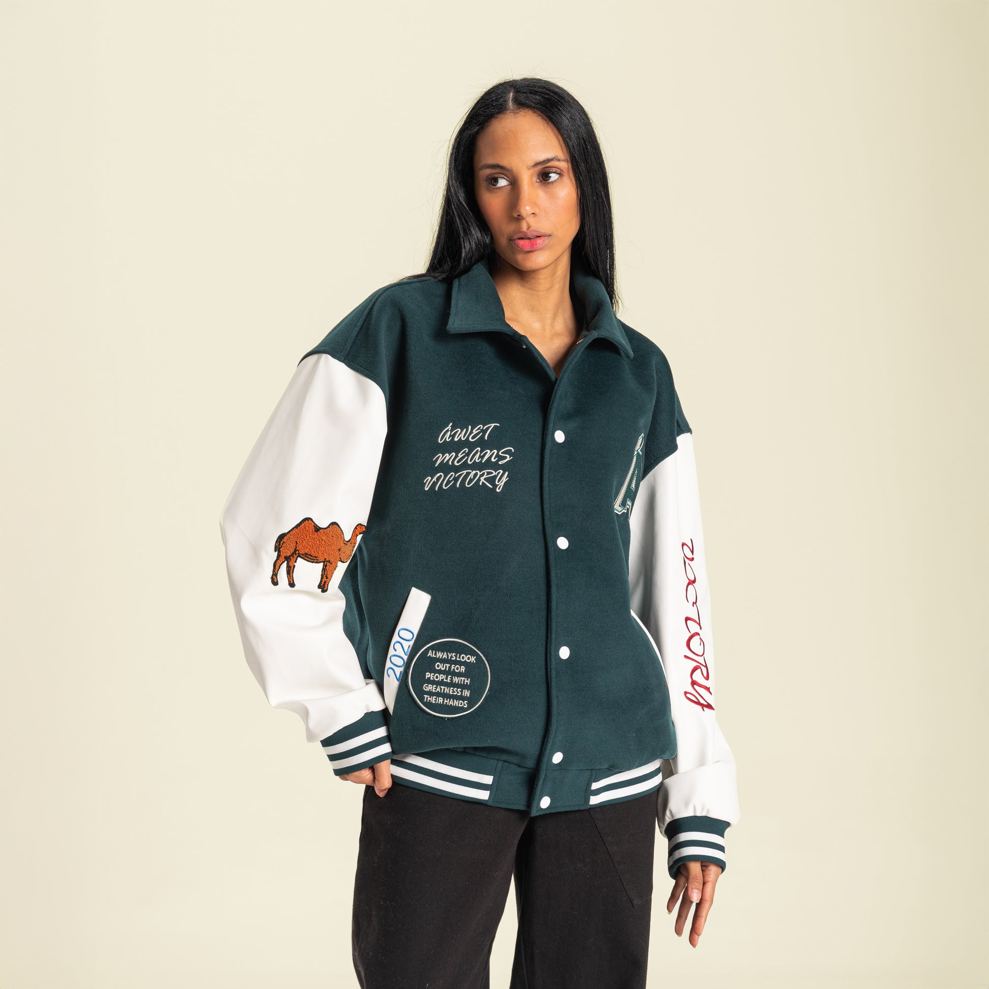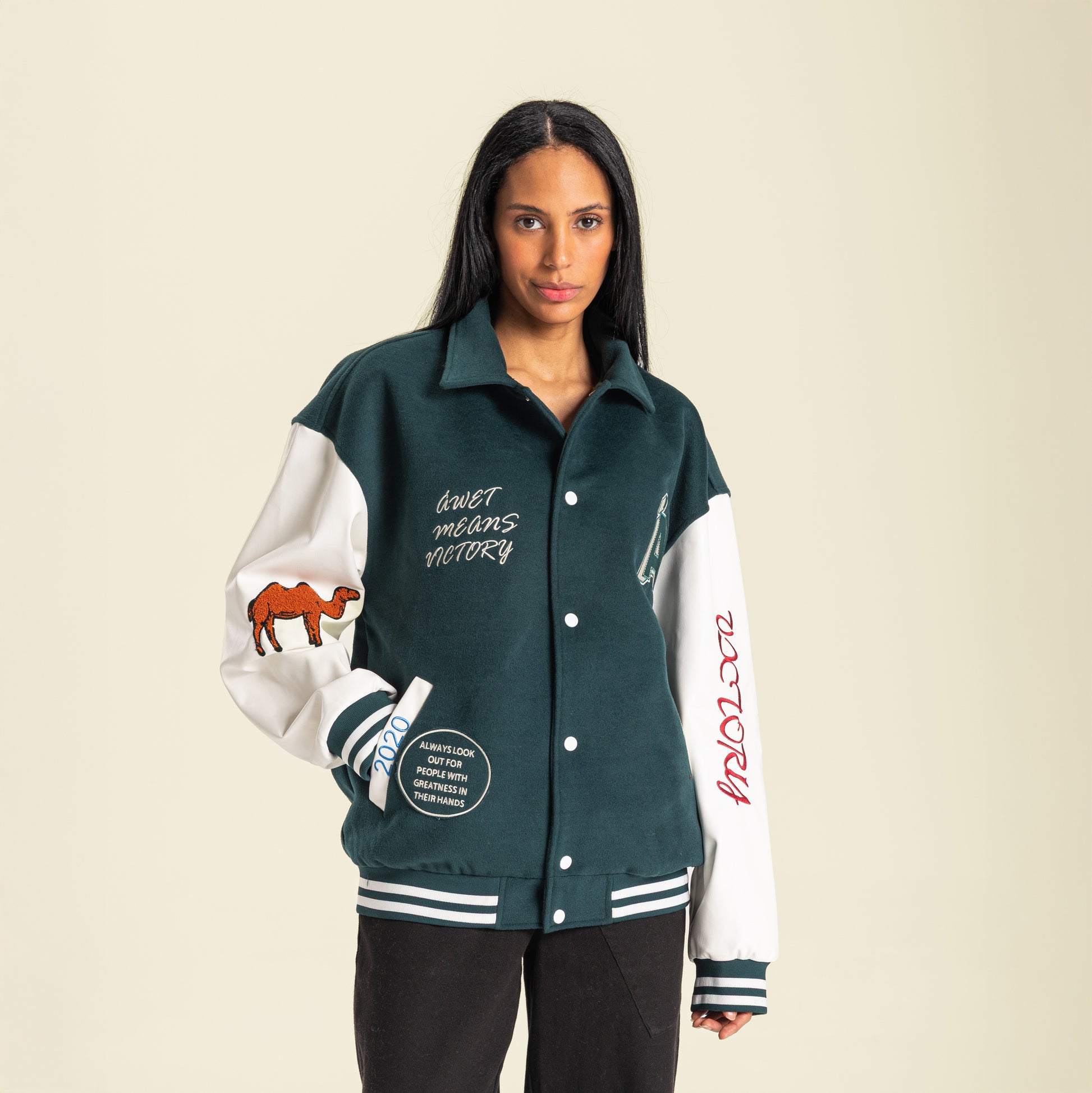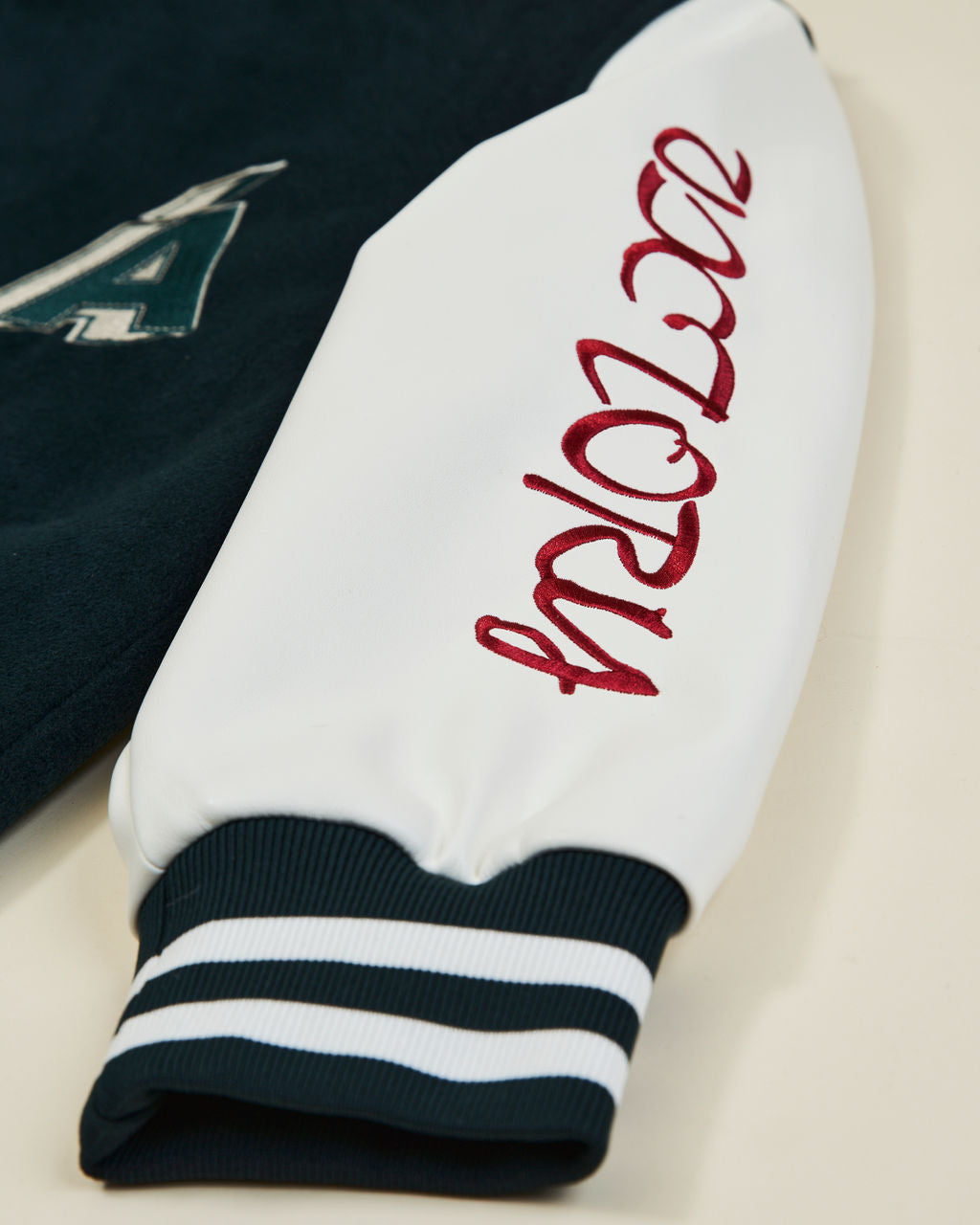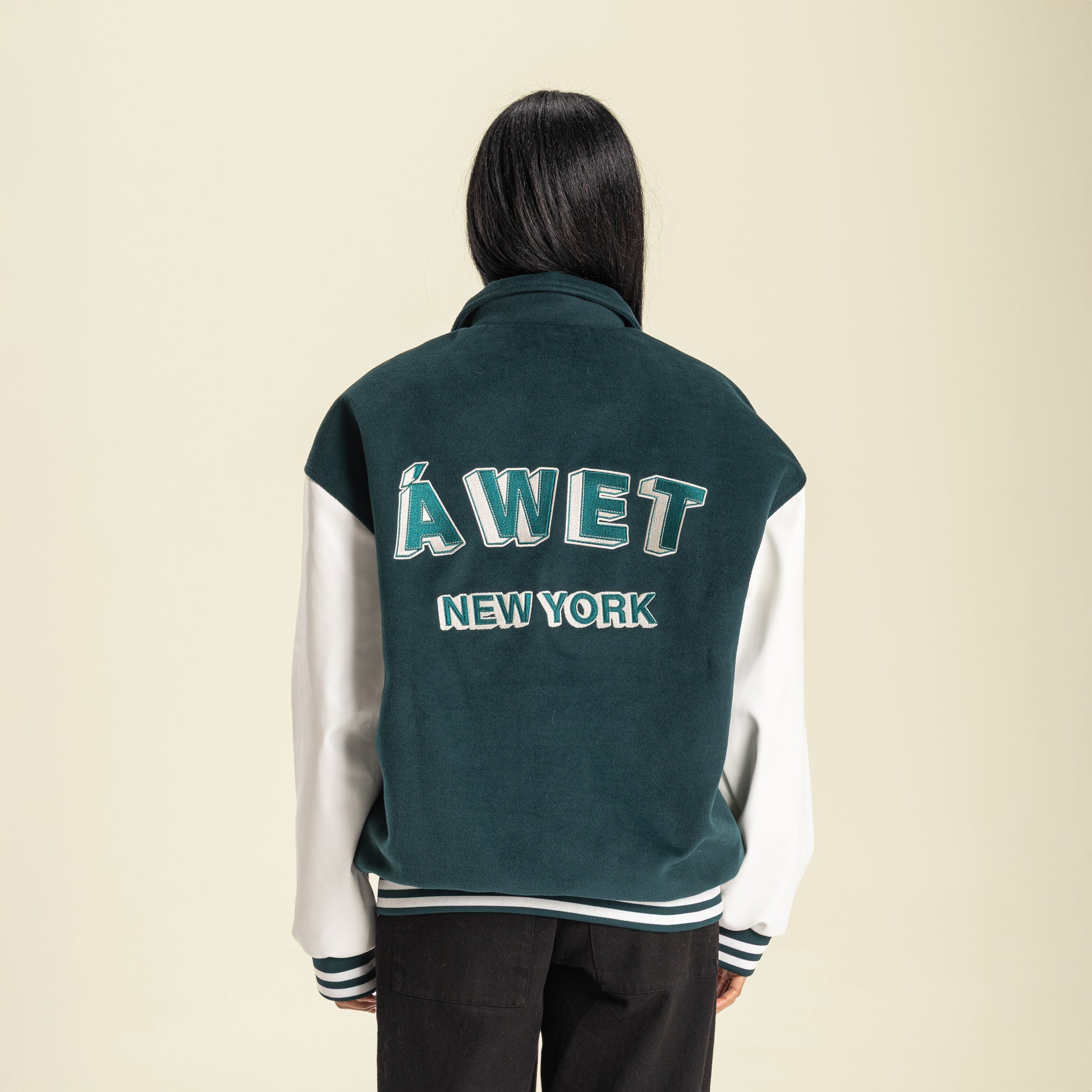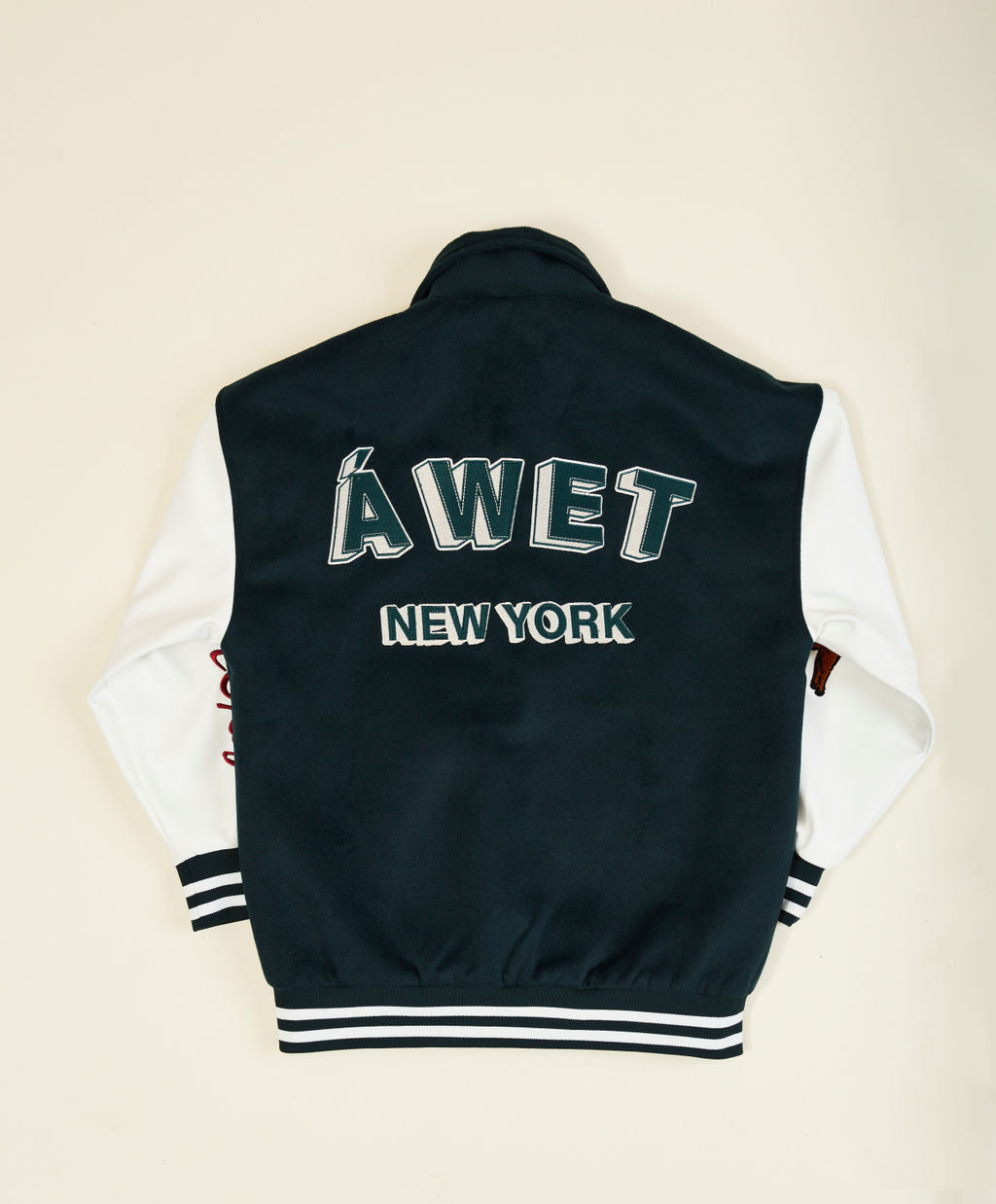 The Áwet New York Varsity Letterman jacket features large branded letter at the chest & a bold logo on the back. Made of leather and a textured wool blend, this style is finished with striped rib-knit trim and a snap-front closure. Additional details include the "Always lookout for those with greatness in their hands quote" that helped inspire the brand.