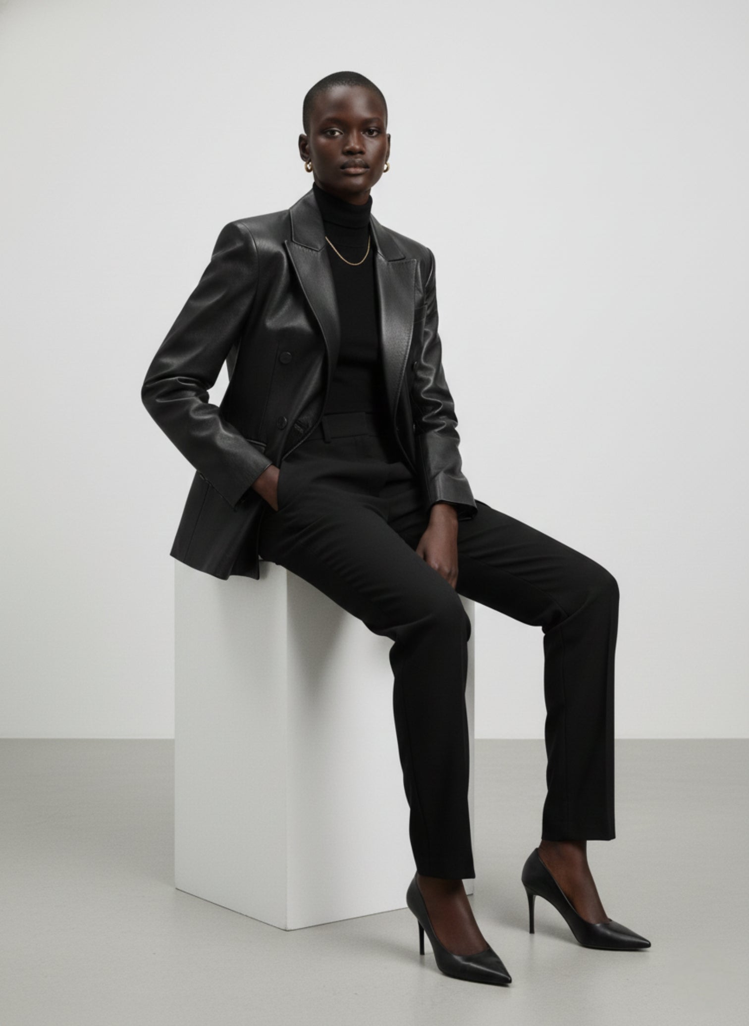 Crafted from luxurious, supple Black Leather, this jacket features a definitive, tailored silhouette with a focus on the strong, structured shoulder. The single-breasted closure and sharp notch lapels lend a classic feel, juxtaposed against the modern, bold texture of the leather.