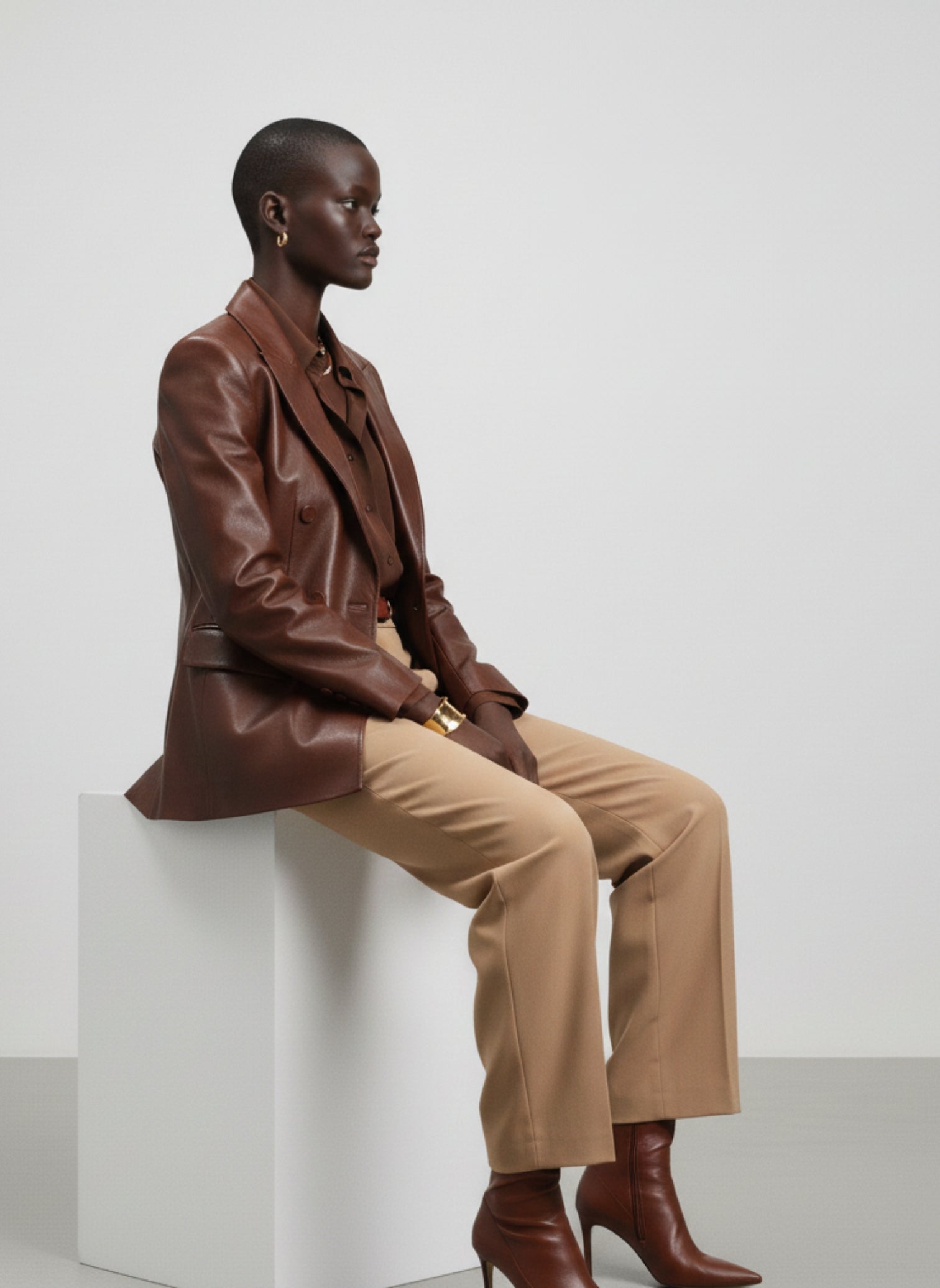 Crafted from luxurious, supple Brown Leather, this jacket features a definitive, tailored silhouette with a focus on the strong, structured shoulder. The single-breasted closure and sharp notch lapels lend a classic feel, juxtaposed against the modern, bold texture of the leather.