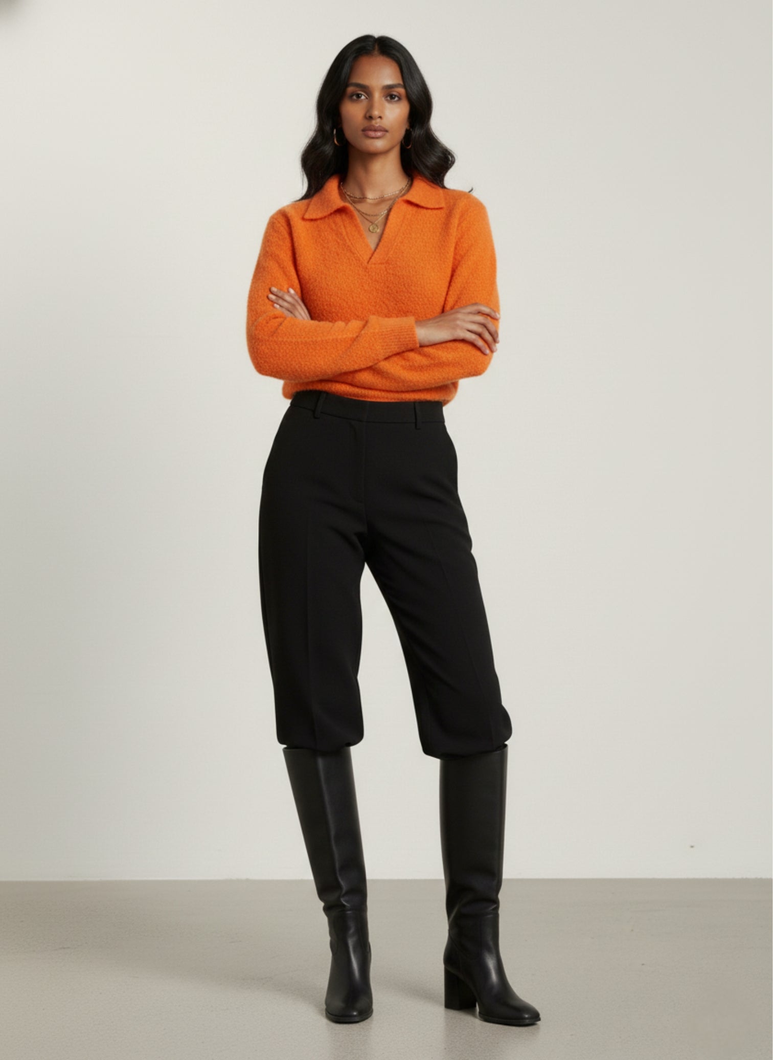 Knit with a fuzzy finish, the Gogo Polo sweater features a classic collared neckline.