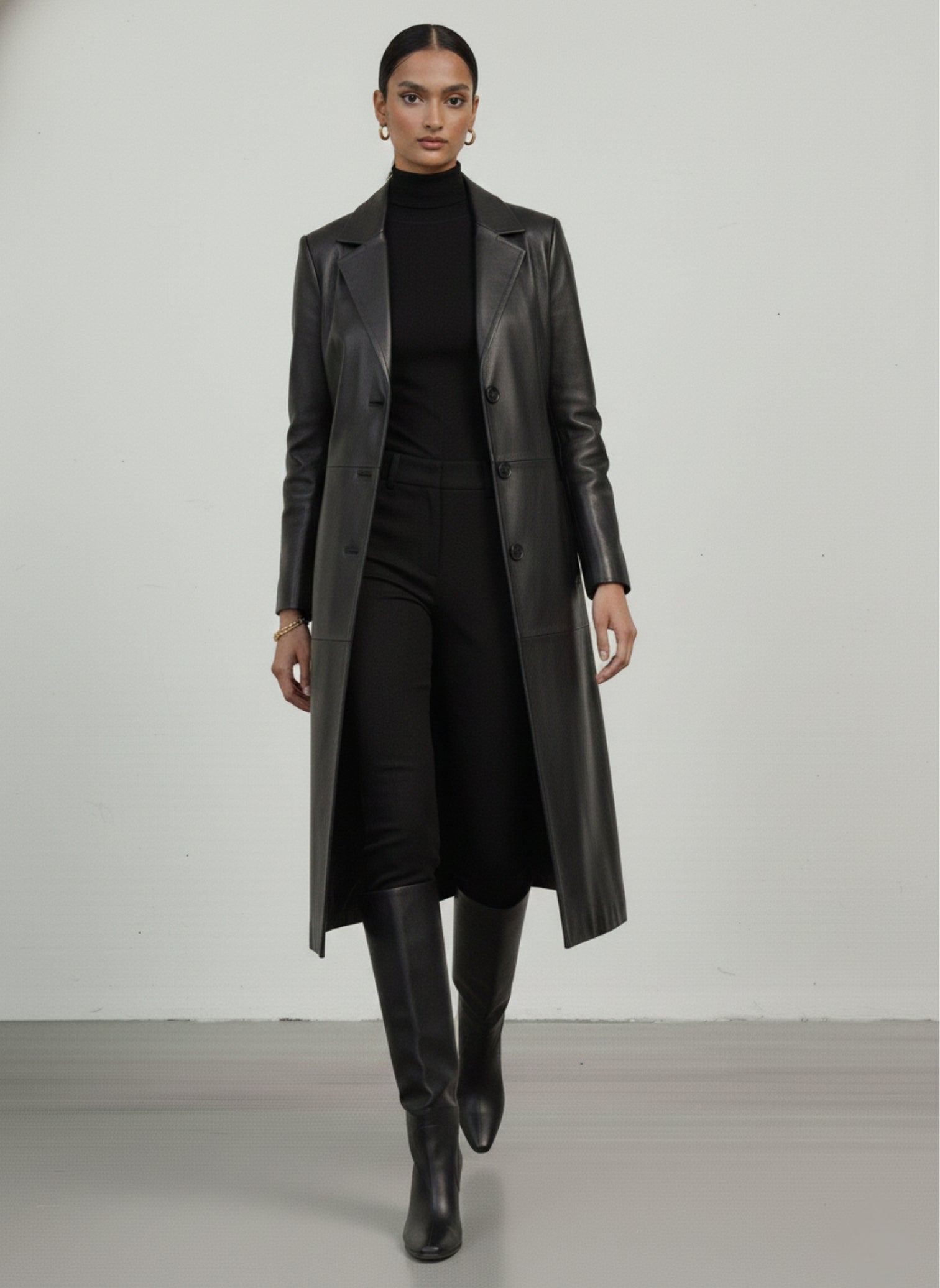 This Black Leather Jacket features a commanding, longline silhouette that drapes with elegant authority. Its classic trench elements, including sharp notch lapels, a single-breasted button closure, are rendered in a sleek, minimalist form. This piece is designed to serve as the ultimate versatile outer layer for the individual who shapes their own style.