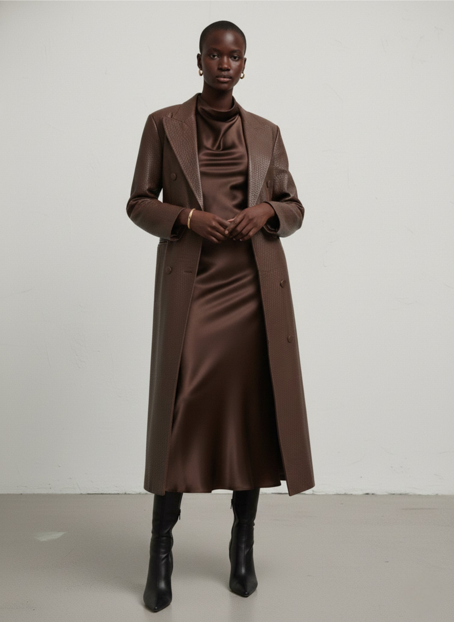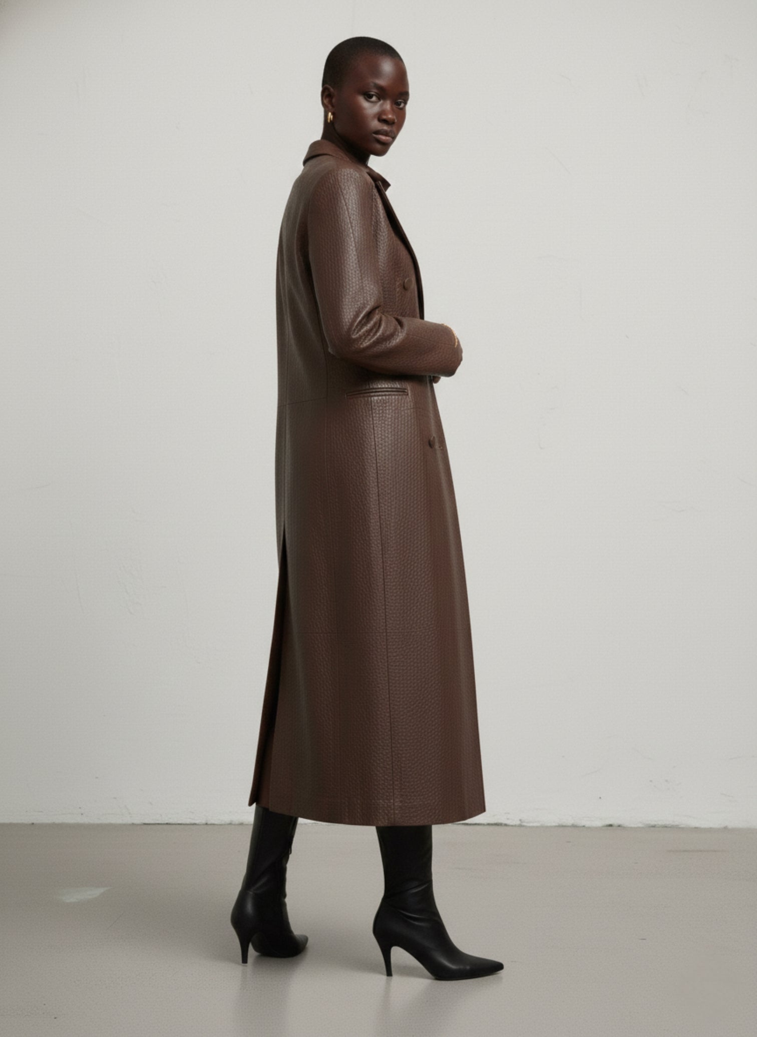 Crafted in a rich Cinnabar Brown, the Bethann Jacket is distinguished by its unique textured, pebble-grain leather finish, giving it an unmatched depth and resilience. The longline, powerful silhouette features broad peak lapels and a classic double-breasted button closure, designed to create a striking vertical line. This statement piece conveys authority and uncompromising style.