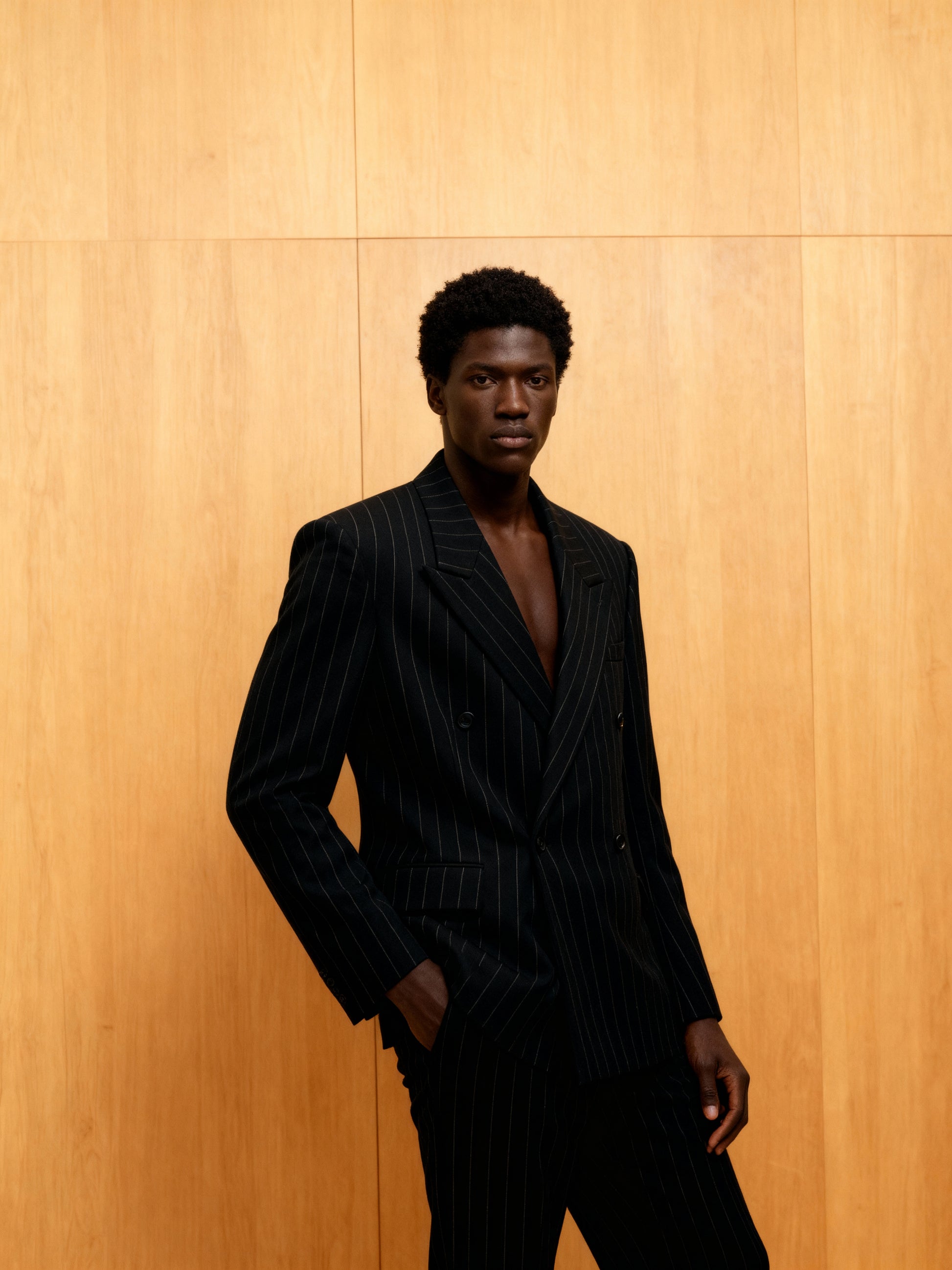 Cut in a relaxed double-breasted silhouette, this jacket elevates classic tailoring with a modern sense of ease. The subtle pinstripe pattern adds quiet depth, while its softly structured shoulders and elongated lines create a confident, understated profile. Designed to move seamlessly between day and evening, it layers effortlessly over a simple tee or crisp shirt.