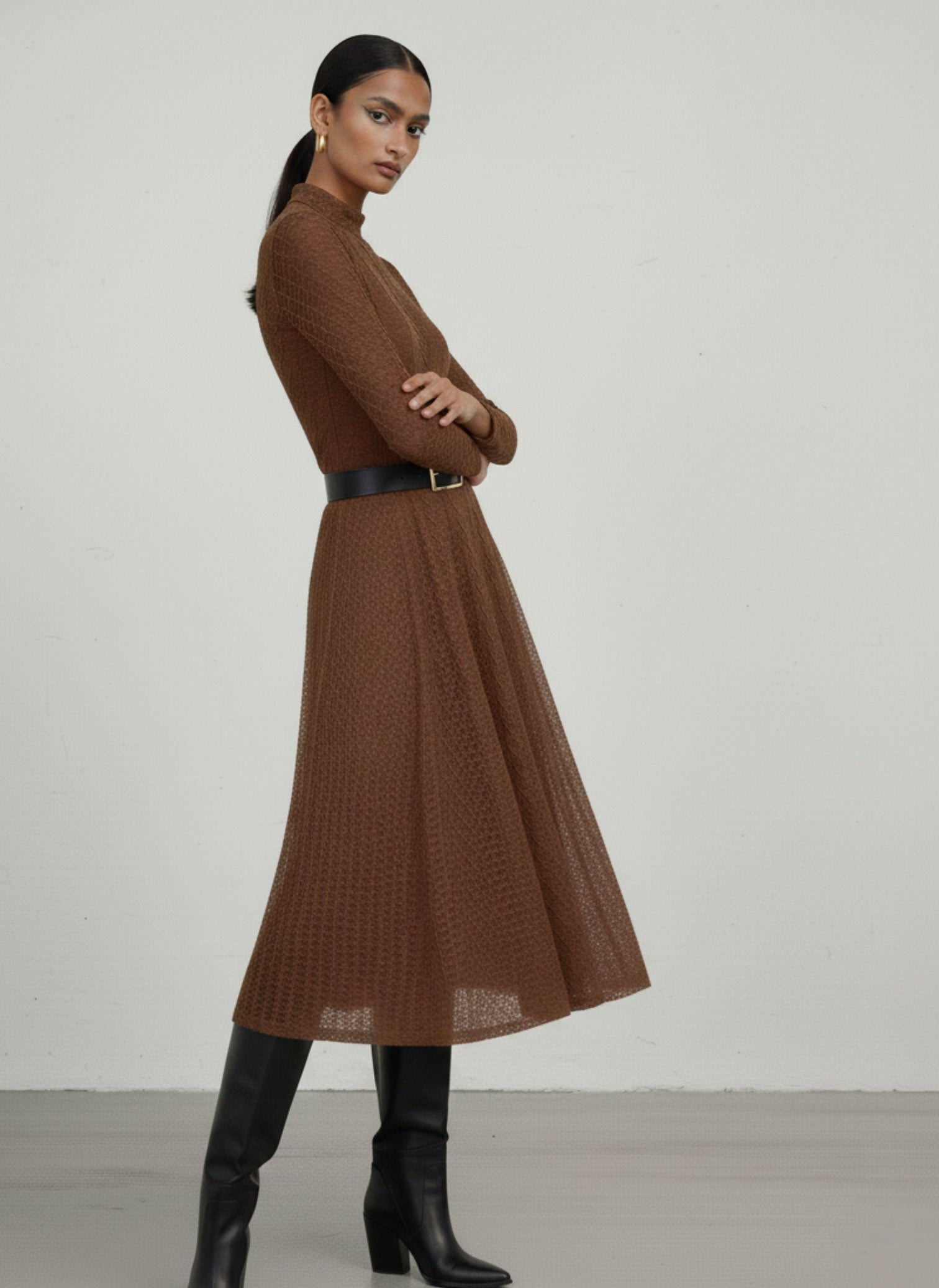 The Sarah dress features a beautiful, all-over textured or lace-like pattern, creating a subtle graphic depth. It is defined by a modest high mock neck and elegant long sleeves. The fitted bodice transitions into a voluminous, A-line midi skirt that hits mid-calf, designed for graceful movement. Available in Rich Chocolate Brown and a subtle Luminous Beige, this is a timeless piece perfect for any elevated occasion.