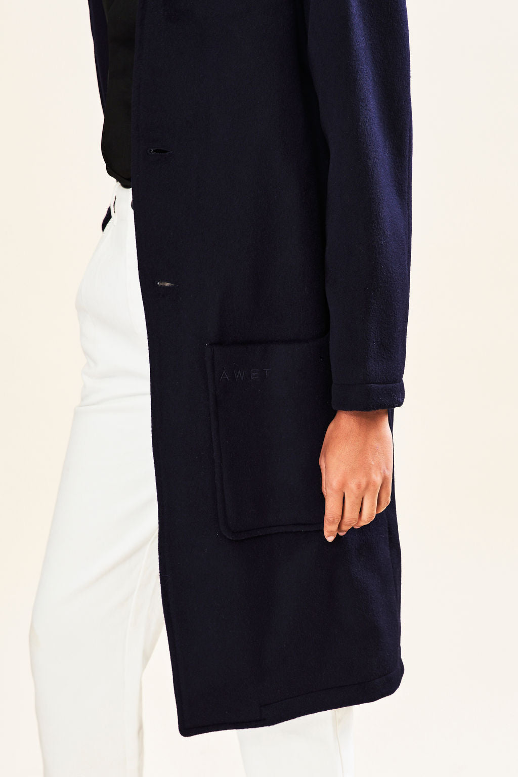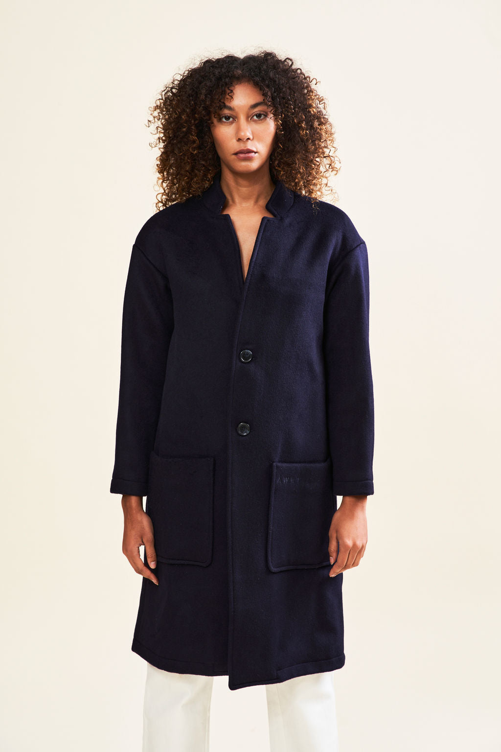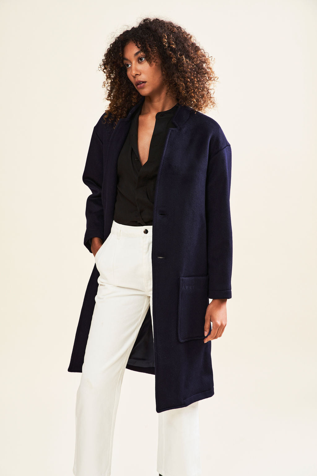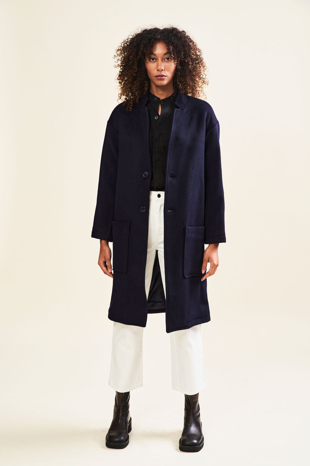 Our St. Urbain coat boasts a standing collar with notched cutouts. Crafted of wool and cashmere, this piece fastens with button-front closures and showcases side patch pockets with an oversized fit.