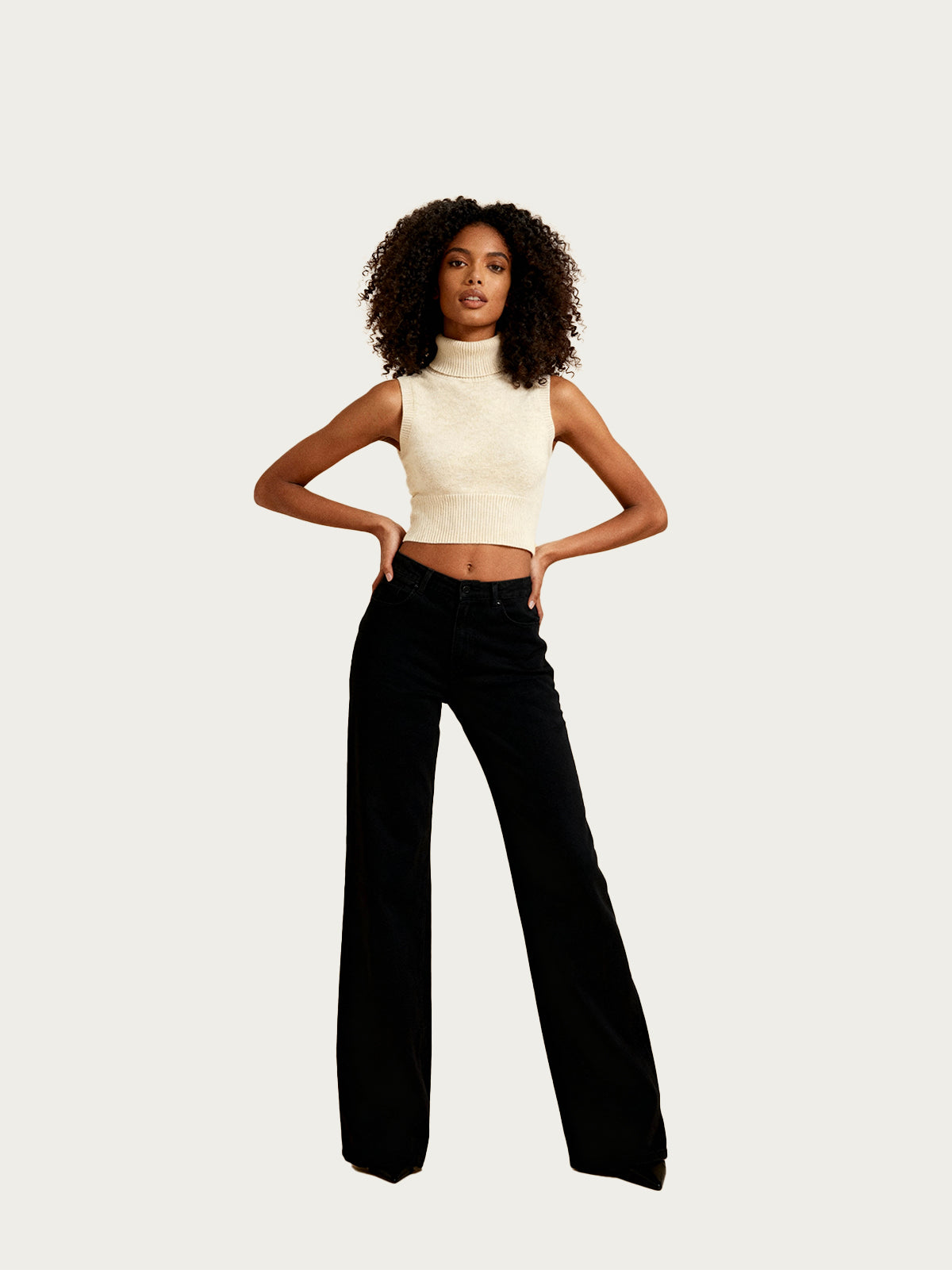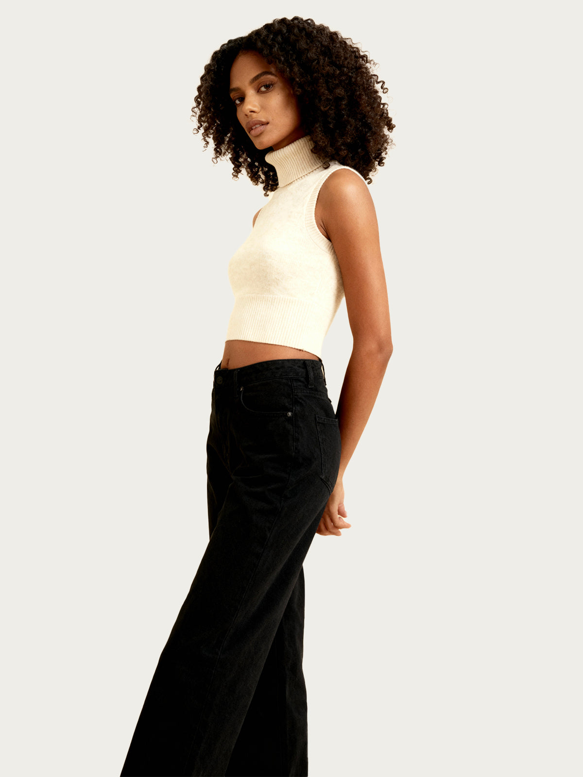 The Anja turtle neck features a high roll-neck and a contemporary sleeveless design. The defining feature is the wide, densely ribbed hem, which creates a defined, sculpted fit and emphasizes the flattering cropped length. It serves as an essential, high-impact layering piece, perfect for transitioning between seasons or pairing with high-waisted trousers and skirts.