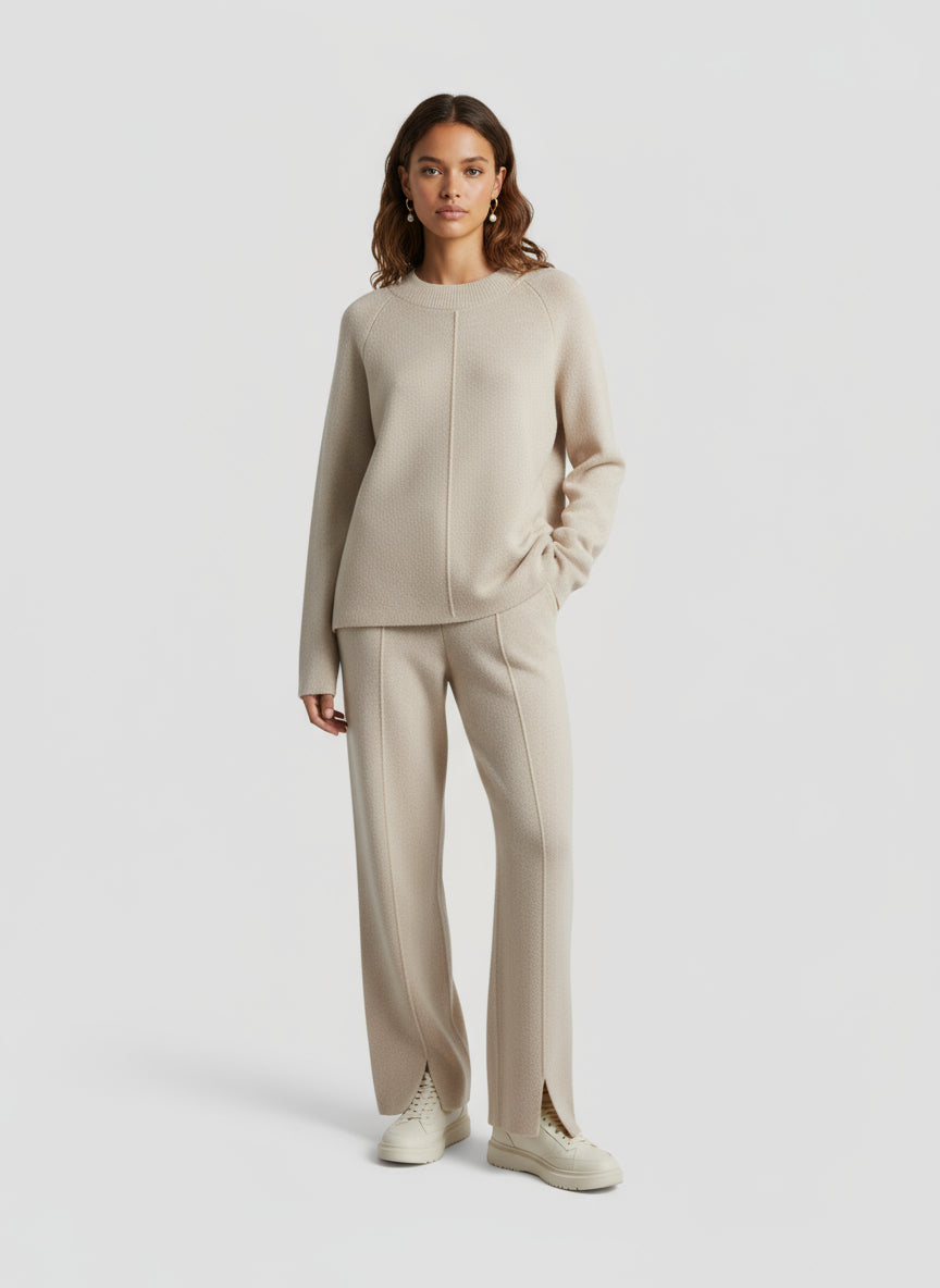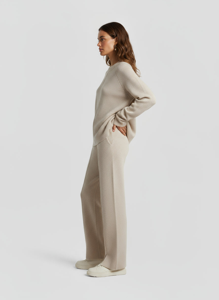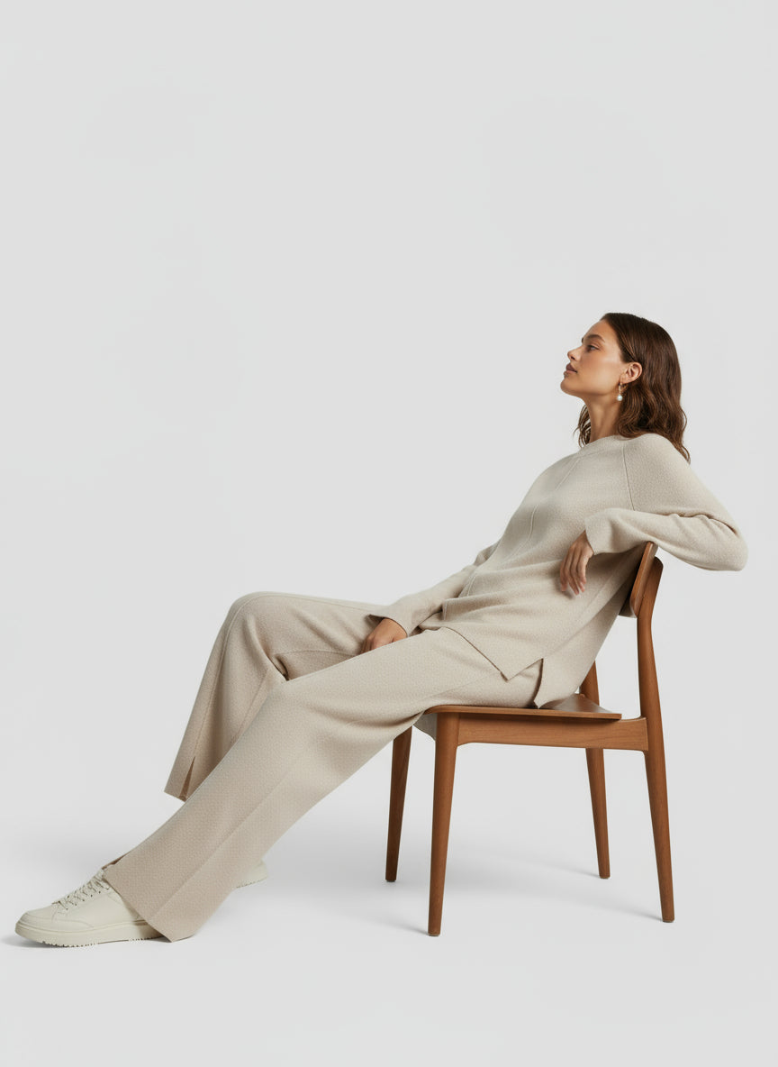 Crafted from a luxurious wool–cashmere blend, the Keelin Top brings an effortless balance of comfort and quiet sophistication. Designed with a relaxed, elongated silhouette, it drapes with ease while maintaining a refined structure. A subtle center seam and rounded neckline highlight minimalist detailing, allowing the texture and craftsmanship to speak for themselves.