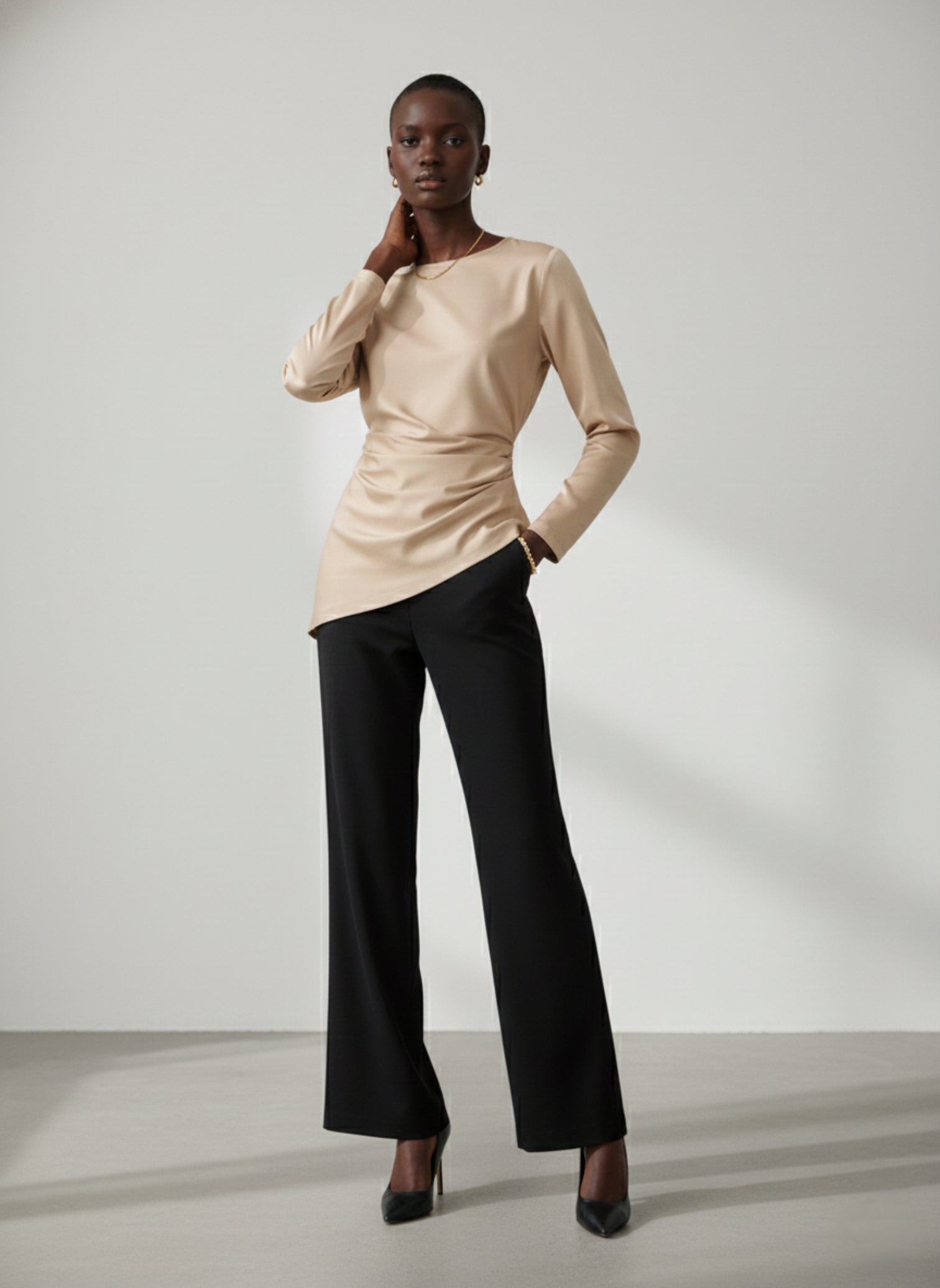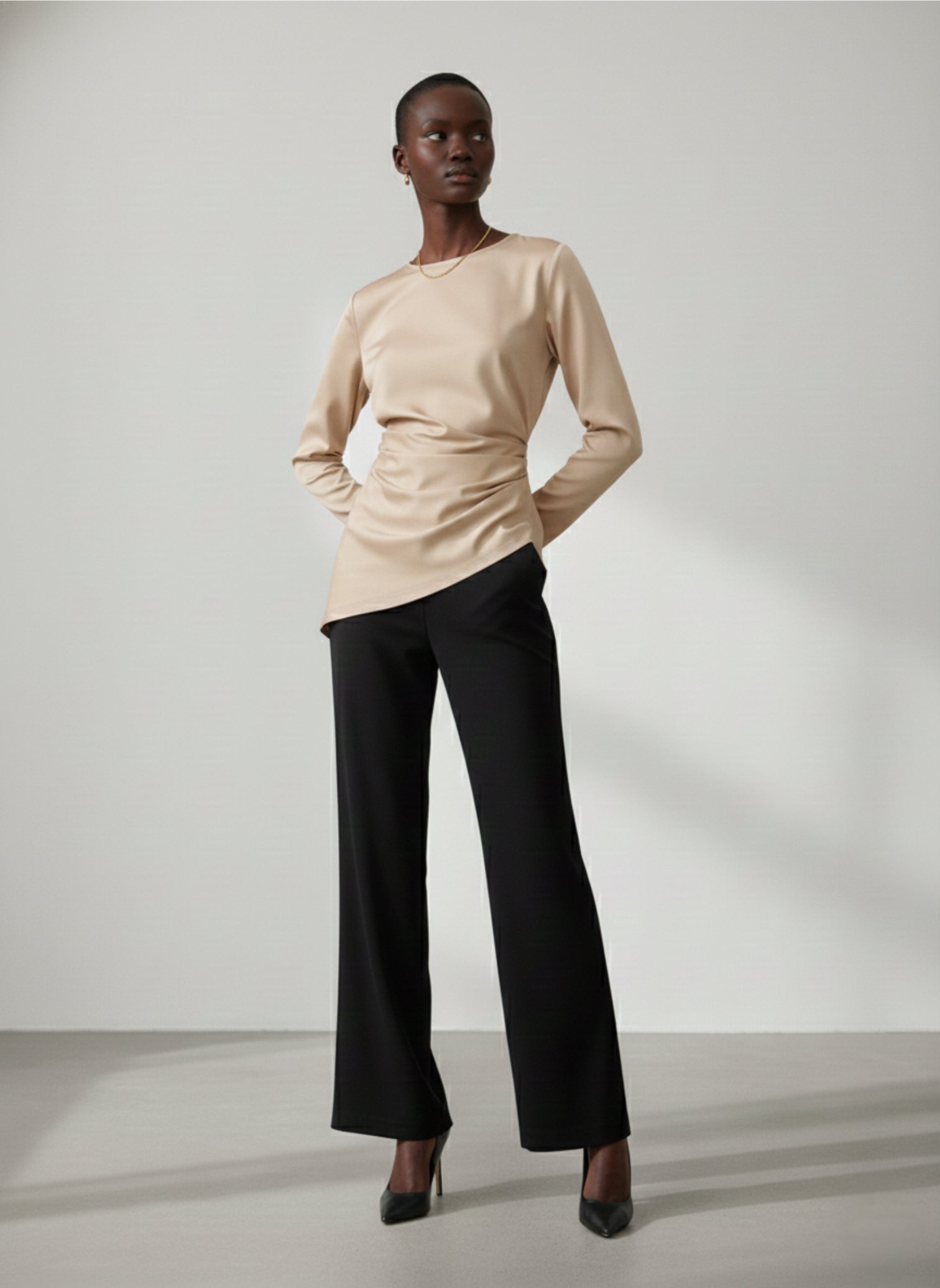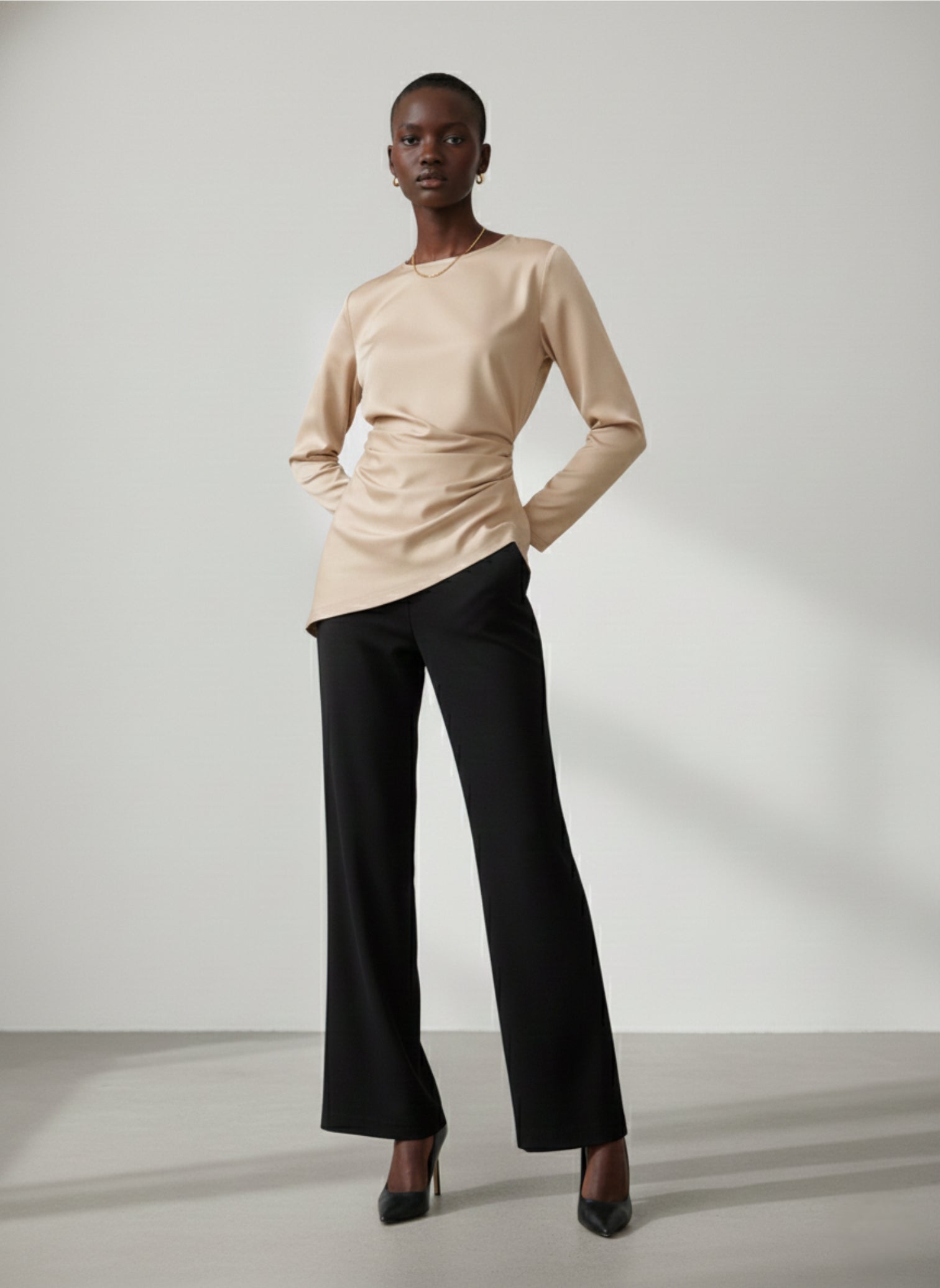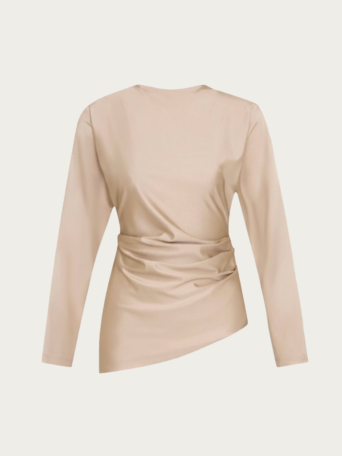 Crafted in a luxurious, flowing Satin Silk Blend in a luminous Beige hue, the Emily Top is defined by its intentional, asymmetrical design. The fabric is meticulously draped and cinched at the waist, creating a flattering, architectural line that falls into a sharp, asymmetrical hem. The classic crew neck and long sleeves provide balance to the dynamic structure. This is the ultimate Top for commanding presence and sophisticated movement.