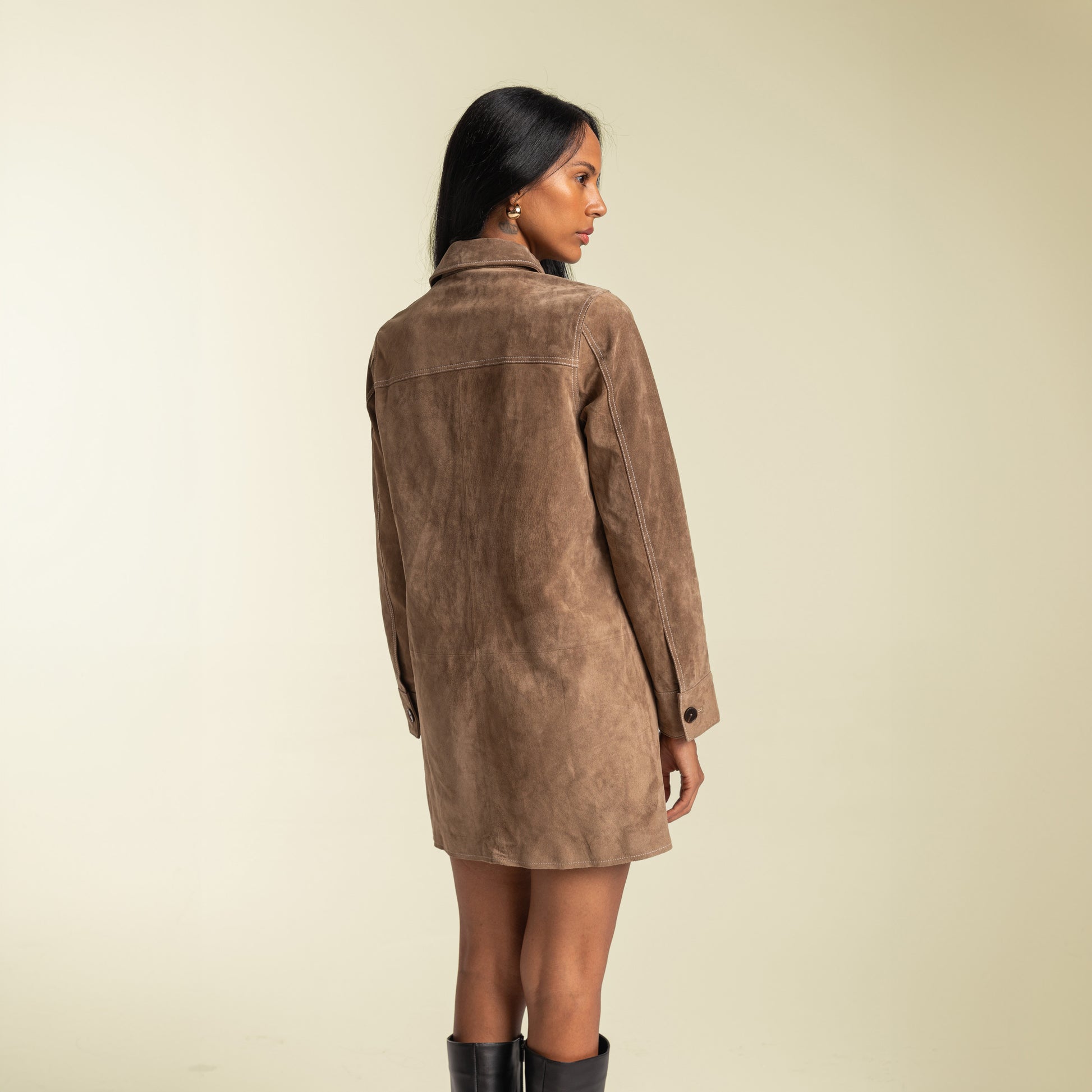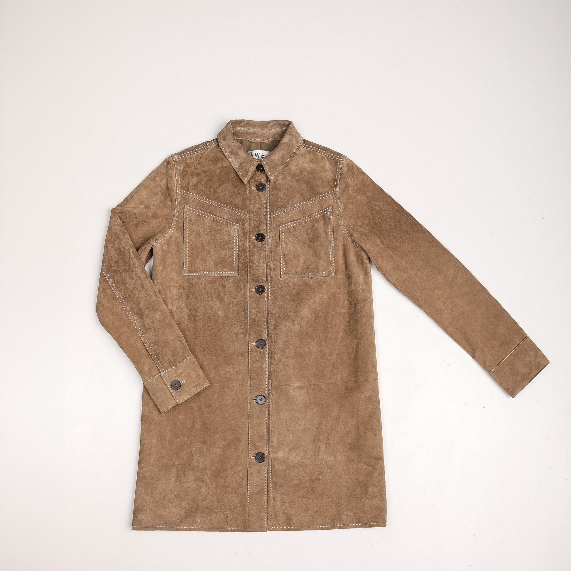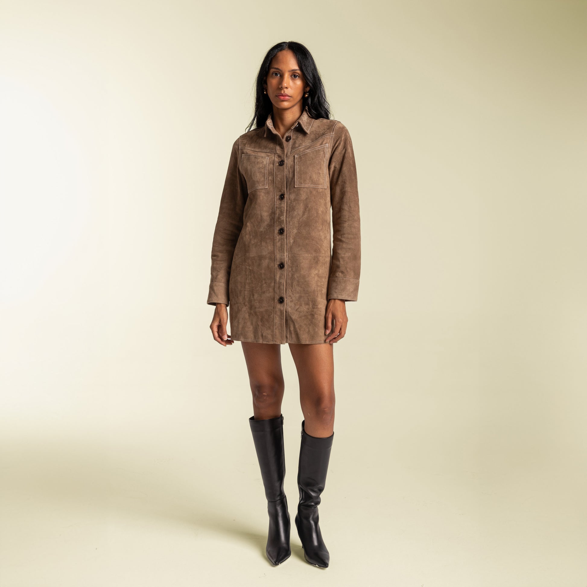 Our suede Ife jacket dress features a utilitarian button-front silhouette with seaming for shape and a soft, distressed finish. Wear as a fall dress or as a jacket for colder weather.
